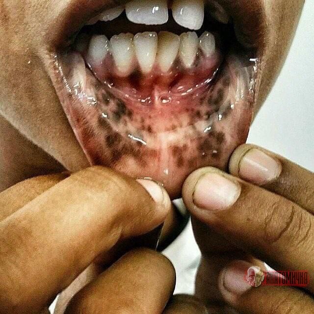 Manchas oscuras en labios, boca y dedos.