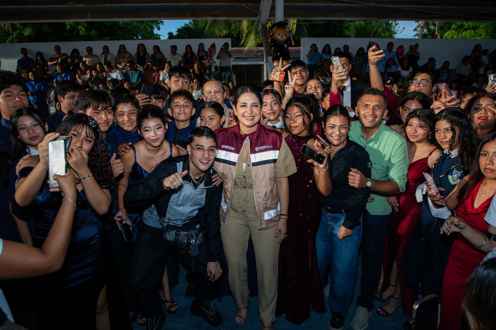 “Yo le dije a mi amigo ‘El Malilla’, mira, hoy se están graduando jóvenes muy especiales, jóvenes extraordinarios, y no puedes empezar tu concierto sin venir a saludarlos, sin venir a felicitarlos y además sin venir a tomarte la foto con ellos”, expresó la presidenta municipal al dirigirse al alumnado y sus familias.