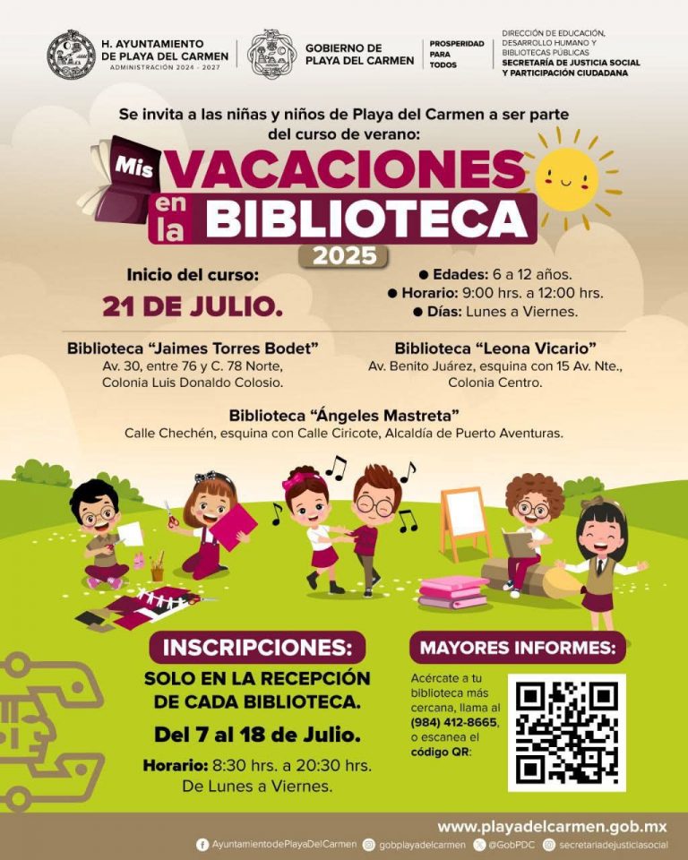 Playa del Carmen, Quintana Roo, 11 de julio de 2025. — Con el objetivo de ofrecer espacios seguros, creativos y formativos durante el receso escolar, el Gobierno Municipal que encabeza la presidenta Estefanía Mercado invita a todas las niñas y niños de entre 6 y 12 años a participar en el tradicional curso de verano “Mis Vacaciones en la Biblioteca 2025”, que dará inicio el próximo 21 de julio en las tres bibliotecas públicas del municipio.