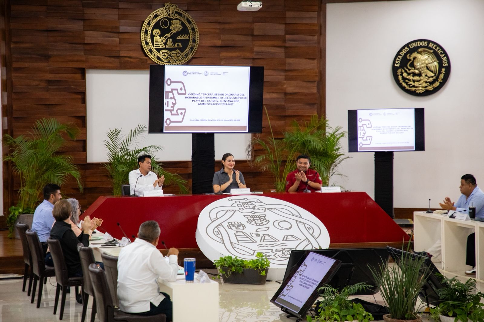 Playa del Carmen, Quintana Roo, 22 de agosto de 2025.– La presidenta municipal Estefanía Mercado encabezó la Vigésima Tercera Sesión Ordinaria de Cabildo, en la que se aprobó por unanimidad la utilización del color “Arena Playa” como distintivo oficial y representativo de la identidad social, cultural y territorial del municipio. Con esta decisión, Playa del Carmen deja atrás la práctica de imponer colores partidistas en la infraestructura pública y consolida un símbolo propio y permanente para la ciudad.