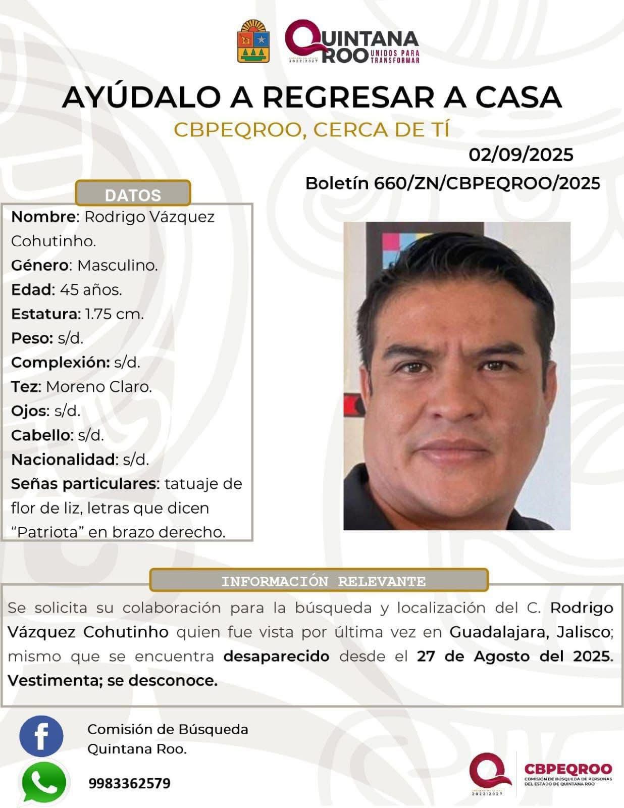 La desaparición de Rodrigo Vázquez Coutiño, conocido como “El Patriota”, no es un hecho menor ni aislado. El último contacto con él se tuvo el 27 de agosto en Guadalajara, y desde entonces, silencio. El gobierno ha emitido una alerta, pero la ausencia de resultados alimenta más sospechas que confianza.