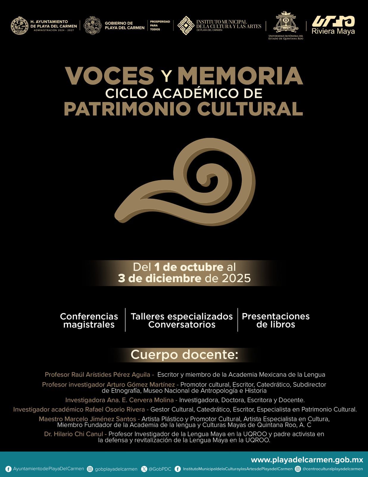 Playa del Carmen, Quintana Roo, 4 de octubre de 2025.- Como parte de la agenda cultural del Gobierno de Playa del Carmen que encabeza la presidenta Estefanía Mercado, el Instituto Municipal de la Cultura y las Artes anunció la realización del programa “Voces y Memoria”, cuyo objetivo es promover el conocimiento histórico y patrimonial de la ciudad entre la comunidad universitaria, portadores culturales y ciudadanía.