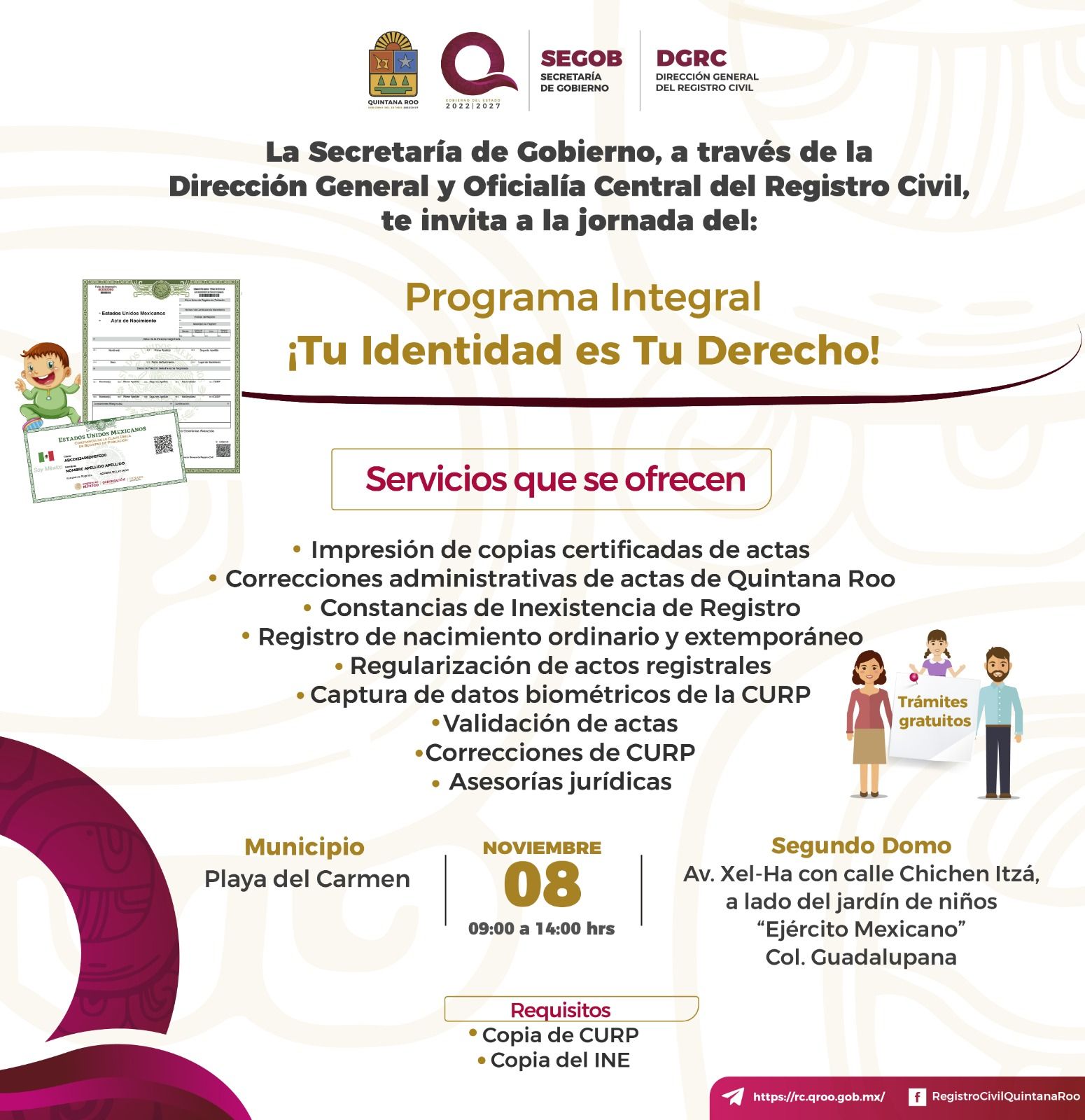 Playa del Carmen, Quintana Roo, 6 de noviembre de 2025.– Con el propósito de garantizar el derecho a la identidad y acercar los servicios del Registro Civil a toda la población, el gobierno de Playa del Carmen, que encabeza la presidenta municipal Estefanía Mercado, invita a la jornada del programa estatal “¡Tu Identidad es Tu Derecho!”, que se llevará a cabo este próximo sábado 8 de noviembre en el segundo domo del fraccionamiento La Guadalupana.