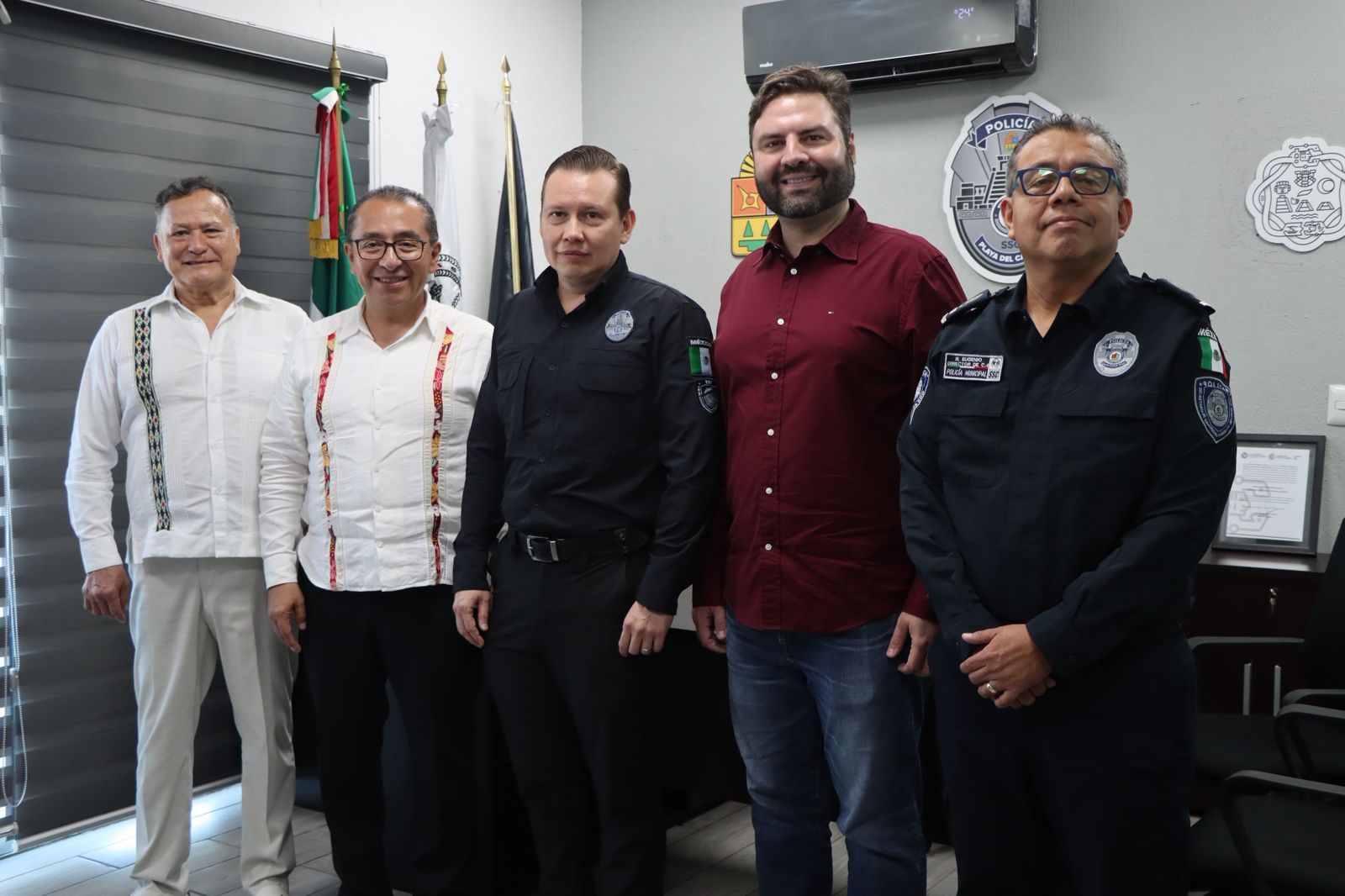 El encuentro fue encabezado por el Mtro. Carlos Alberto Montesinos García, secretario de Seguridad Ciudadana, con la participación de Antón Bojórquez, secretario de Desarrollo Económico y de Atracción de Inversiones del municipio; Julio César Sánchez Amaya, responsable del sector Seguridad e Industria del Transporte de la Secretaría de Economía, y Rafael Orlando Eugenio Santiago, director del C4.