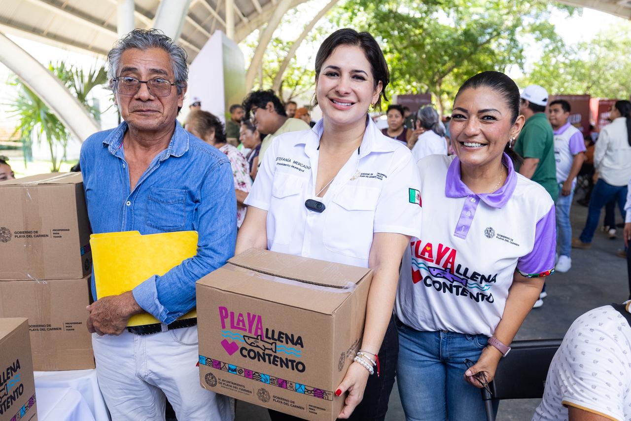Durante el recorrido, la Presidenta Municipal entregó apoyos alimentarios del programa “Playa Llena, Corazón Contento”, coordinado por la Secretaría de Justicia Social y Participación Ciudadana, sin acto protocolario y con acceso abierto al público. También, entregó colchones donados por el Tren Maya a familias que más lo necesitan.