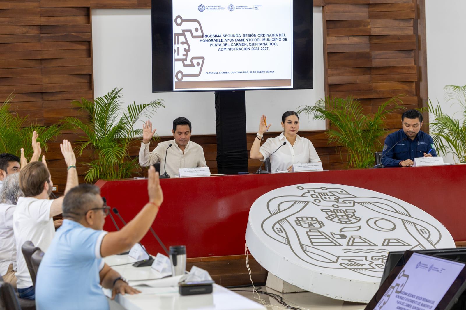 Playa del Carmen, Quintana Roo, 9 de enero de 2026.— La presidenta municipal Estefanía Mercado encabezó la Trigésima Segunda Sesión Ordinaria de Cabildo, en la que fueron aprobadas reformas al párrafo tercero del artículo 10 de la Constitución Política del Estado de Quintana Roo, enviada por la XVIII Legislatura del Congreso del Estado para su validación por los ayuntamientos.