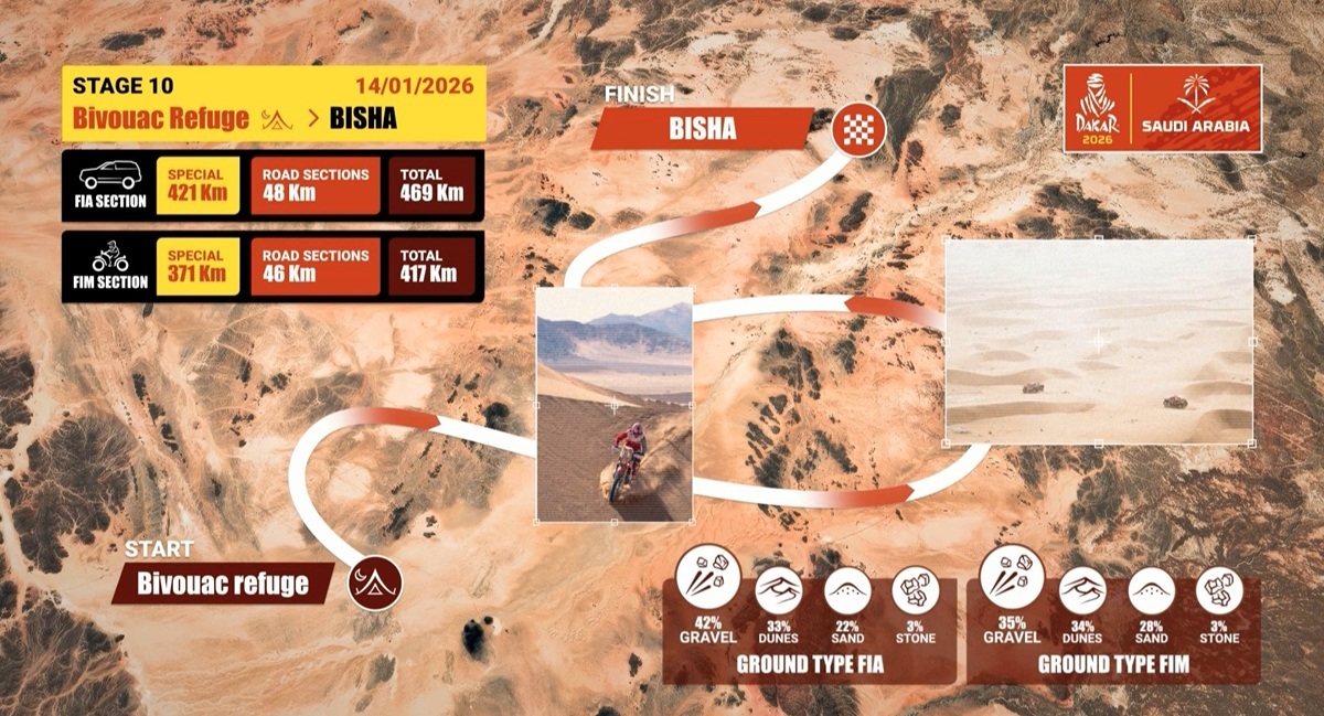 Tras pasar la noche en un vivac, los pilotos se adentrarn en la etapa 10 con la meta ubicada en Bisha. La arena es la gran protagonista del da, exigiendo a los aventureros a exprimir su tcnica para surfear las dunas con xito durante la mayor parte de la jornada, si bien el tramo final ofrece pistas ms clsicas y escollos como piedras.