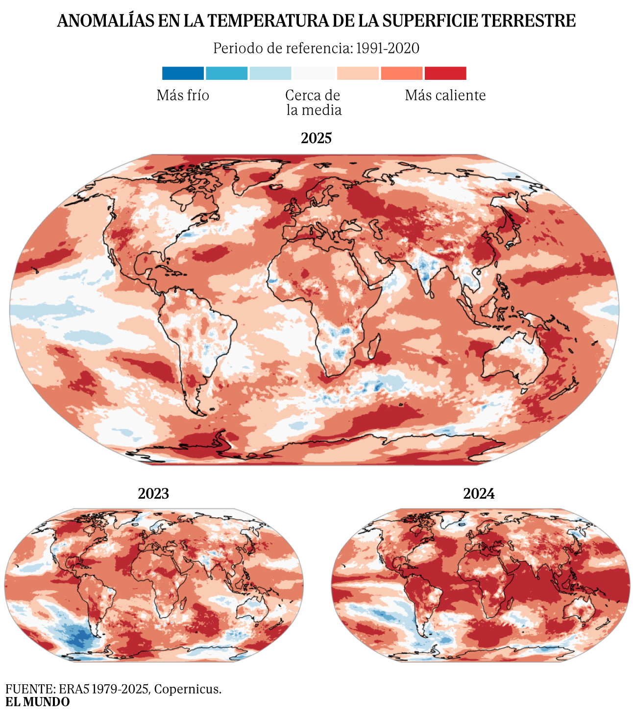 El informe climtico que hace balance de 2025 confirma la tendencia de calentamiento que vive la Tierra: el ao que acaba de terminar ha sido el tercero ms caluroso desde que hay mediciones, y se ha quedado cerca de los dos aos ms clidos registrados hasta la fecha: ha sido slo 0,01 grados ms fro que 2023 y 0,13 grados ms fro que 2024, que sigue liderando el ranking de los aos ms caluroso a nivel mundial.