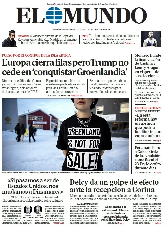 Portada de EL MUNDO del jueves 15 de enero de 2026. Disponible en Orbyt desde las 23.30h. y cada da en tu quiosco, la mejor informacin siempre con EL MUNDO. Suscrbete aqu a PREMIUM y tendrs acceso ilimitado a todo el contenido