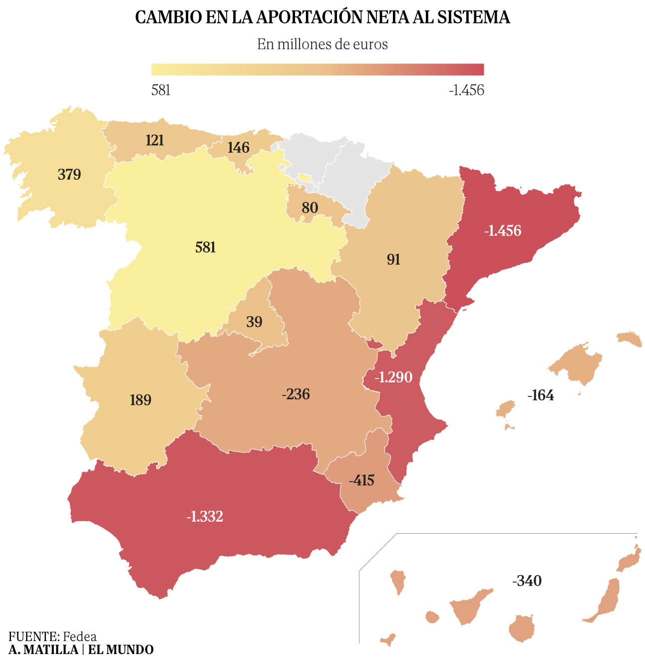 Otra forma de verlo es la rebaja que reciben las CCAA en su aportacin al sistema con los nuevos criterios. Para De La Fuente est claro que la Generalitat aportar 1.456 millones anuales menos. Es decir, la mayor rebaja de todas las de rgimen comn por encima de los 1.300 de Andaluca y Comunidad Valenciana y a aos luz de los 39 millones de mejora que se le asigna a la Comunidad de Madrid. La regin que preside Isabel Daz Ayuso se consolidara con creces como la mayor contribuyente neta del sistema al seguir indemnes las forales. y no tener blindado como Catalua, el llamado principio de ordinalidad.