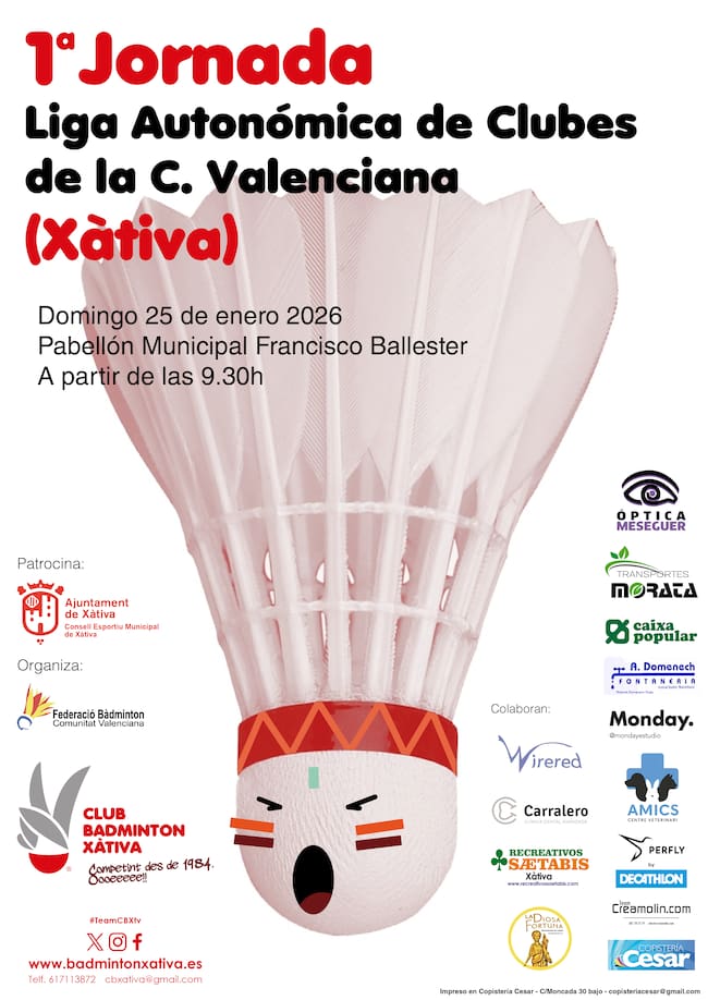 Además, el domingo 25 de enero dará comienzo una nueva edición de la Liga Autonómica de Clubes, en la que el Club Bádminton Xàtiva estará representado por dos equipos: CB Xàtiva – Caixa Popular y CB Xàtiva – Dental Carralero. La primera jornada se celebrará en Xàtiva, en el Pabellón Municipal Francisco Ballester, a partir de las 9:00 horas, y desde el club se invita a la ciudadanía a asistir y apoyar a los equipos en el inicio de la competición.