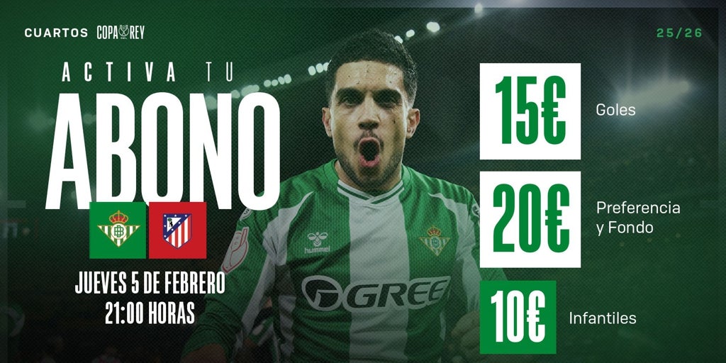 El Real Betis ha publicado los precios para la activación de abonos de cara al partido de cuartos de final de la Copa del Rey que se disputará el próximo 5 de febrero en el estadio de la Cartuja ante el Atlético de Madrid. La … entidad heliopolitana ha anunciado que «al igual en anteriores compromisos, los abonados podrán acceder al partido activando su abono, esta vez al precio de 10 euros para infantiles, 15 euros para los abonados de Gol Norte y Gol Sur, y 20 euros para los abonados de las gradas de Fondo y Preferencia. El plazo se ha abierto hoy y se extenderá hasta el próximo 28 de enero a las 9.00 horas».