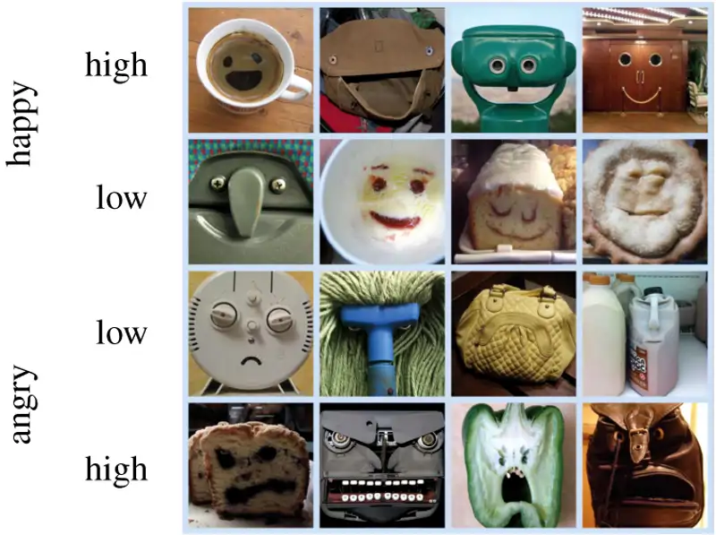 Aquí observamos distintos ejemplos de objetos que producen pareidolias. Al igual que la detección de rostros, nuestra capacidad para detectar expresiones está ajustada para favorecer respuestas rápidas a la información facial que señala la valencia emocional (en este ejemplo, alegría o ira). El beneficio de una detección sensible y rápida de expresiones faciales supera el costo de los falsos positivos ocasionales.