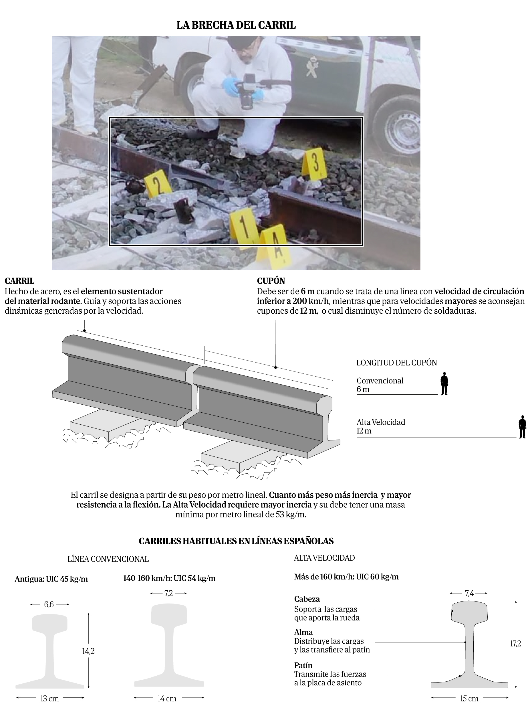 Además, las pesquisas apuntan a que las muescas en las ruedas se produjeron al pasar por un posible defecto de soldadura en la vía. De forma paralela a la investigación de la CIAF, la Guardia Civil también ha situado la rotura del carril como una de las principales líneas de investigación y ha analizado las ruedas dañadas mediante la toma de muestras con moldes, según fuentes del caso.