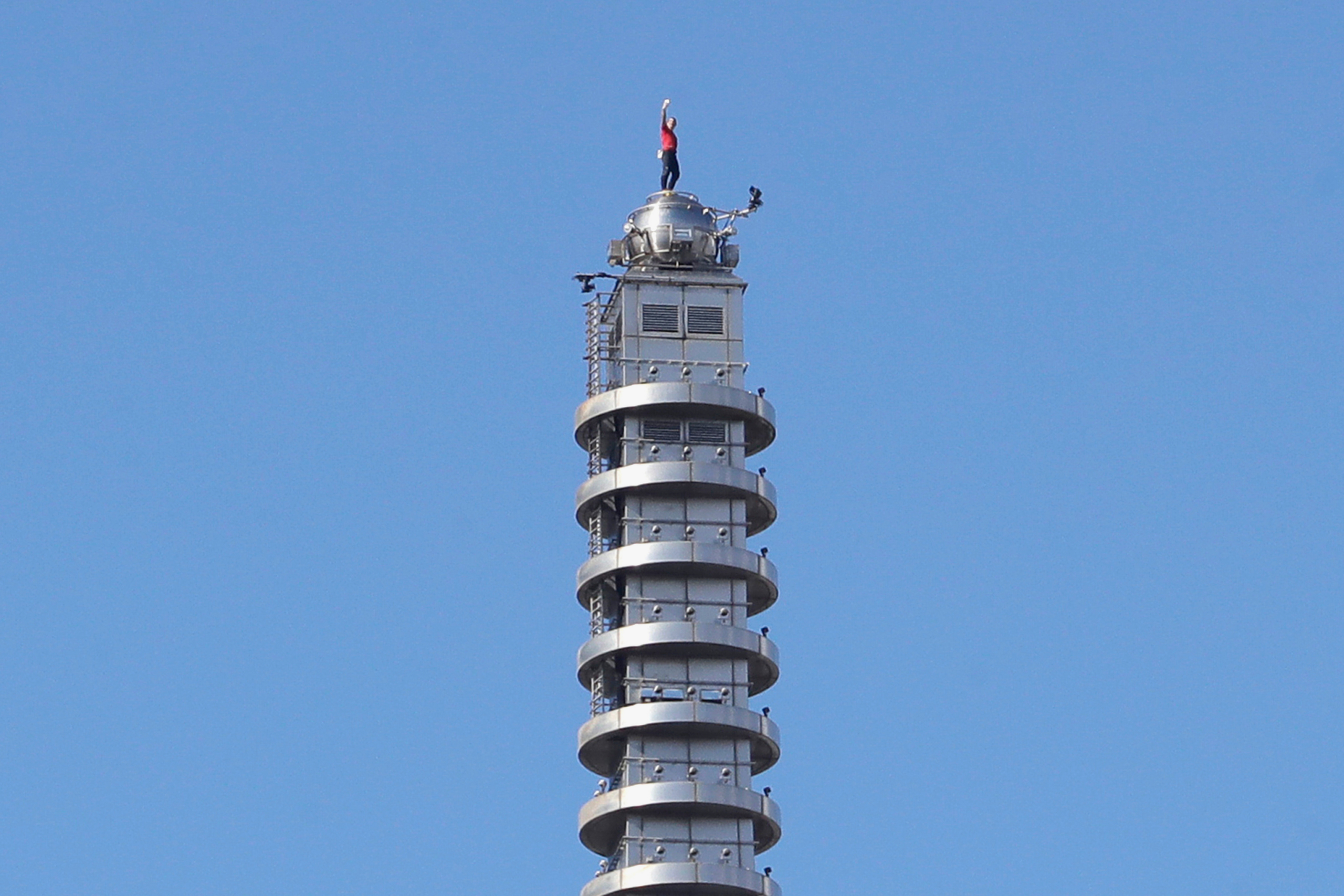 La fase final, considerada la ms peligrosa por los organizadores, comenz al alcanzar la torre superior del edificio, donde los desplomes exigieron toda la fuerza de sus brazos. Desde all avanz por los anillos hasta la aguja, rematada por una pequea esfera metlica suspendida sobre el vaco, donde se hizo un ‘selfie’ para la posteridad.