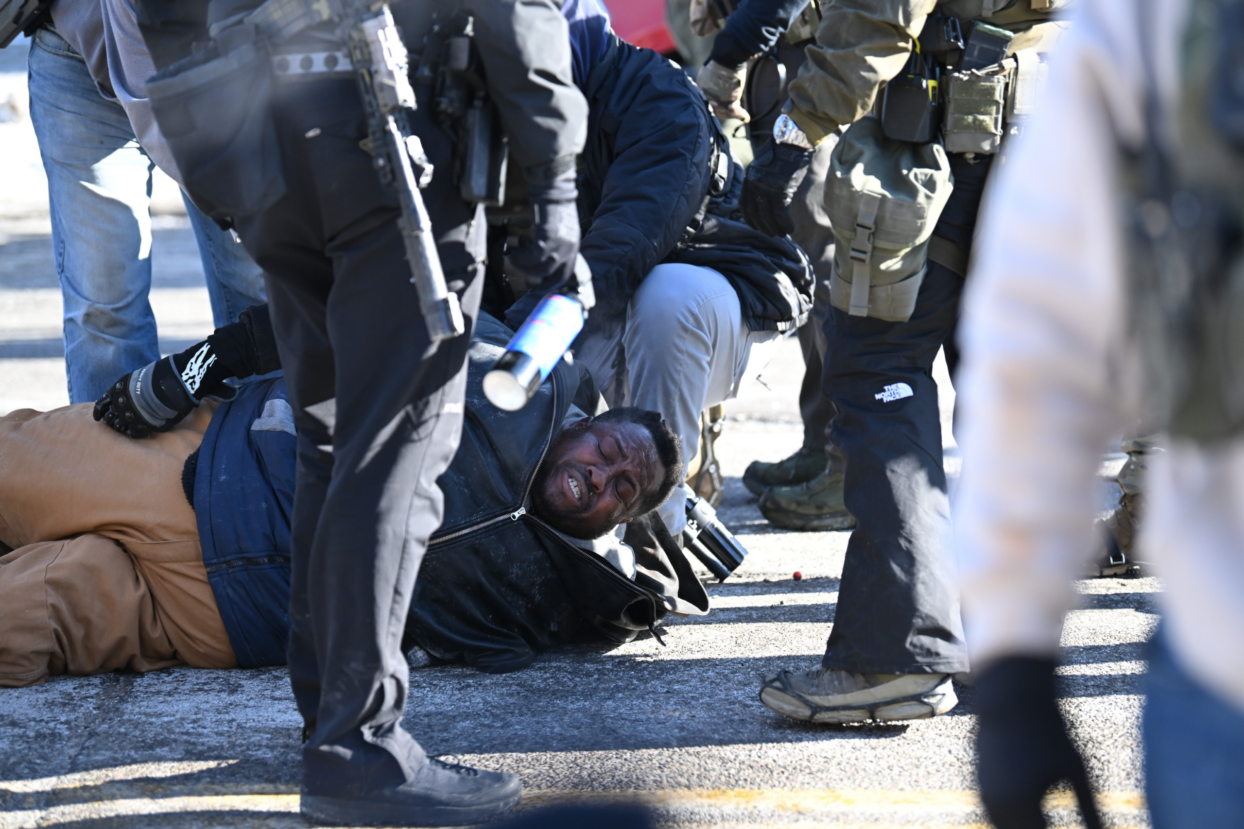 Oficiales detienen a un manifestante en una protesta contra el ICE, en Minepolis.
