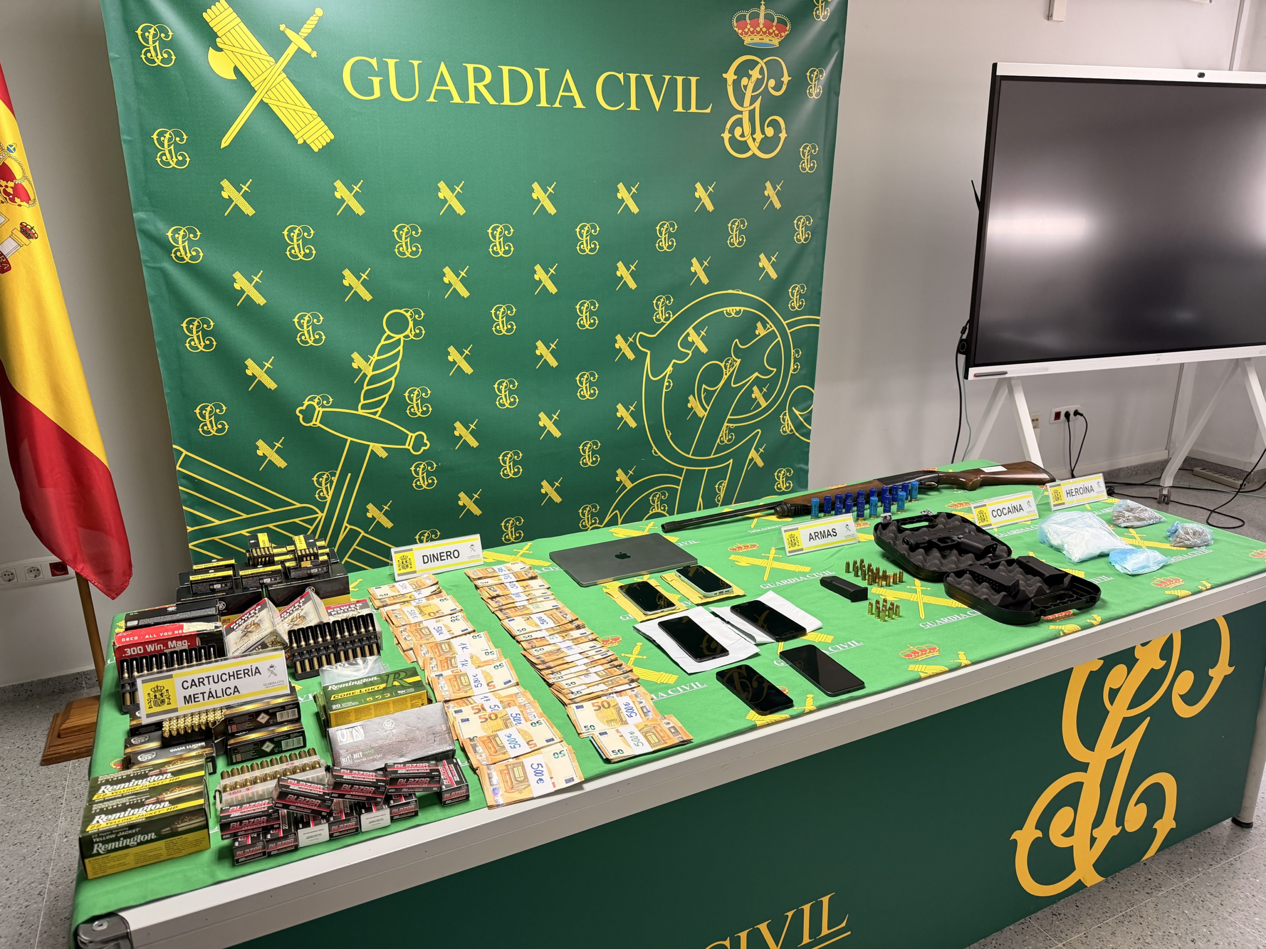 En estos registros se ha intervenido una pistola de �ltima generaci�n, de la que uno de los investigados trat� de desprenderse, cargadores de pistola, m�s de 8.000 cartuchos de distintos calibres de arma corta, una escopeta semiautom�tica, 320 gramos de coca�na, 160 gramos de hero�na, cerca de 32.000 euros en efectivo y diversos dispositivos electr�nicos, como ordenadores y tel�fonos m�viles.
