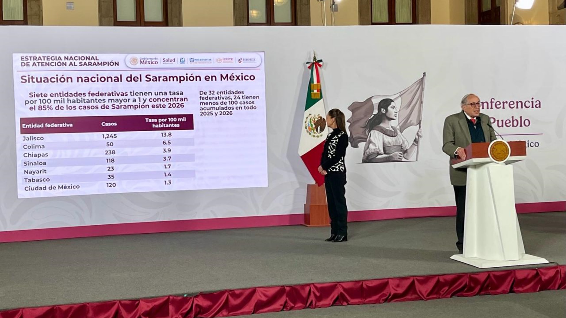- De acuerdo con la Secretaría de Salud, estos siete estados de la República mexicana tienen una tasa de 100 mil habitantes mayor a 1 y concentran el 85% de los casos de sarampión, en 2026.
