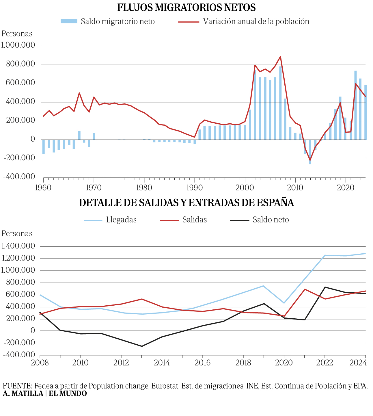 Esto supone que el lastre demogr�fico queda amortiguado gracias a la ganancia neta de inmigrantes. En los a�os 2000, Espa�a se convirti� en el pa�s europeo que m�s poblaci�n extranjera recib�a, con una media anual de 600.000 llegadas, lo que fue determinante para que la poblaci�n total creciera a tasas cercanas al 2%. Desde 2008, con la crisis econ�mica, los flujos migratorios netos descendieron y llegaron a ser negativos entre 2012 y 2015, a�os del gran exilio de j�venes nativos. Desde entonces se han recuperado hasta quedar el saldo neto medio en 650.000 personas al a�o durante el periodo 2022-2024.