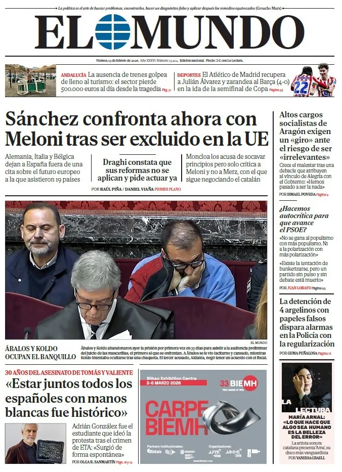 Portada de EL MUNDO del viernes 13 de febrero de 2026. Disponible en Orbyt desde las 23.30h. y cada d�a en tu quiosco, la mejor informaci�n siempre con EL MUNDO. Suscr�bete aqu� a PREMIUM y tendr�s acceso ilimitado a todo el contenido