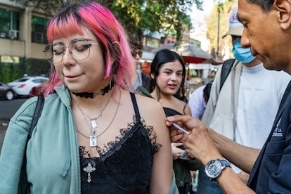 El clima en las filas de los módulos es de temor y poca claridad sobre quién debe vacunarse. Los enfermeros repiten las indicaciones: “Personas de 10 a 49 años, no embarazadas o personas lactando”. Algunos admiten no tener claro cuáles son los síntomas o el nivel de riesgo, pero buscan tranquilidad en la inyección. “¿Te quieres sentir seguro? Vacúnate”, dice un cartel que cuelga del puesto. José Pablo Reyes, de 24 años, y Solari Jesús Pérez, 19, estudian en la Universidad Insurgentes, a unos pasos de Balderas. Están en receso cuando ven la carpa de la Secretaría de Salud. “Vamos a vacunarnos, güey”, persuade el primero. Ya con el algodón presionando el brazo tras el pinchazo, cuentan que hasta hace poco no habían siquiera considerado aplicarse la vacuna. Fue la noticia del fallecimiento de una bebé de tres meses por sarampión, que se dio a conocer este martes, la que encendió la alerta y les cambió la percepción. “Después de la experiencia del covid, todo puede pasar”, dice Solari. Valeria Mejía, de 19 años, también estudiante de esa universidad, llama por teléfono mientras avanza la fila: “Mamá, ¿estoy vacunada de sarampión?”. La respuesta es breve: “No sé, tú vacúnate”.