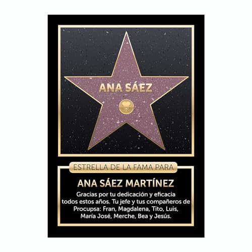 Si siempre has so�ado con ser un/a estrella… aqu� tienes la tuya. Nada menos que una r�plica de las estrellas del Paseo de la Fama en Hollywood en el que puedes poner tu nombre y una dedicatoria (y elegir entre varias opciones de tipo de letra). La placa es de PVC y tiene unas dimensiones de 19 x 27 cm.