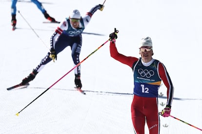 Son 1.547m sube y baja sobre nieve, un bocadito de nada para el ogro Johannes Klaebo, una montaña de dolor para los demás, entre ellos los españoles, decimoquintos en la final. Aunque lo cubren en más o menos tres minutos, los esquiadores lo comparan a un 800m de atletismo: máxima velocidad desde el comienzo y sprints repetidos, hasta la zona roja, en cada montículo, y al final, claro. Como una clásica de ciclismo en las Ardenas. La capacidad de recuperar tras cada aceleración es la clave, lo que dicen de amar el lactato, acogerlo y alimentarse de él. Los esfuerzos se repiten una y otra vez. Es la llamada prueba de sprint por equipos de dos, lo que supone cuatro milquinientos en solo dos horas para cada esquiador. Uno para clasificarse y lograr un buen puesto en la salida, y tres, uno cada tres minutos, para cubrir las seis postas.