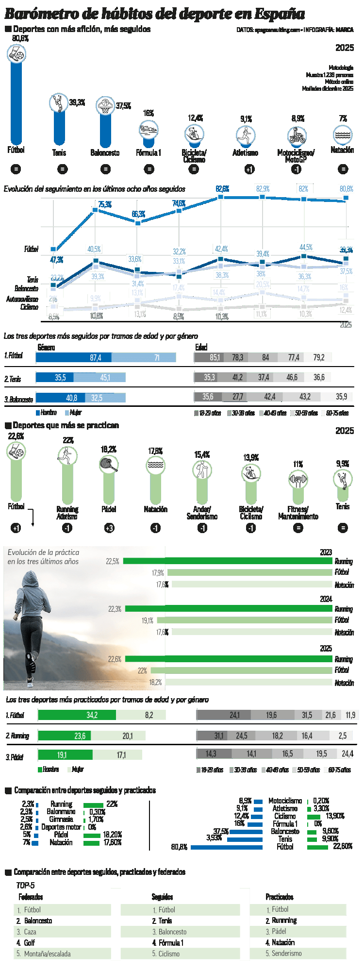 La escena cambia cuando la pregunta pasa de “qué sigues” a “qué practicas”. Ahí el relato se complica. Fútbol (22,6%) y running (22,0%) lideran la práctica deportiva en un empate técnico. Tras ellos aparecen el pádel (18,2%), la natación (17,6%), andar o senderismo (15,4%) y el ciclismo (13,9%). El balón monopoliza la conversación pública, pero comparte casi al milímetro el esfuerzo real con una disciplina silenciosa, individual y ubicua como el running.