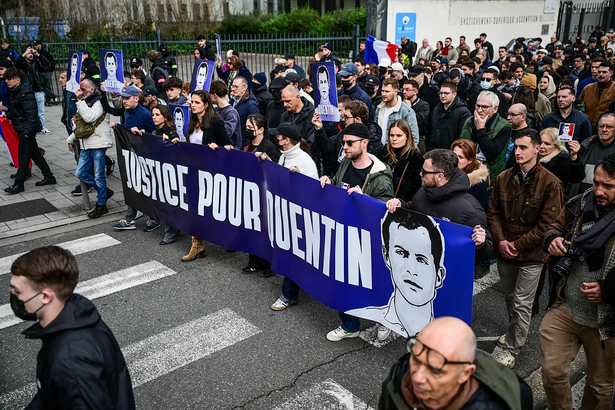 “Quentin, matado por la milicia de Jean-Luc Mélenchon” podía leerse en el ubicuo poster del joven fallecido, en referencia directa a la Guardia Joven y al líder de La Francia Insumisa (dos asistentes parlamentarios figuran entre los siete detenidos). La presencia de jóvenes ultras, con mascarillas negras, fue mayoritaria en la marcha, que arrancó unas emotivas declaraciones de Domitille Casarotto, amiga de Quentin: “Era un joven discreto y recto, católico y nacionalista; para mí, como un hermano y un amigo”.