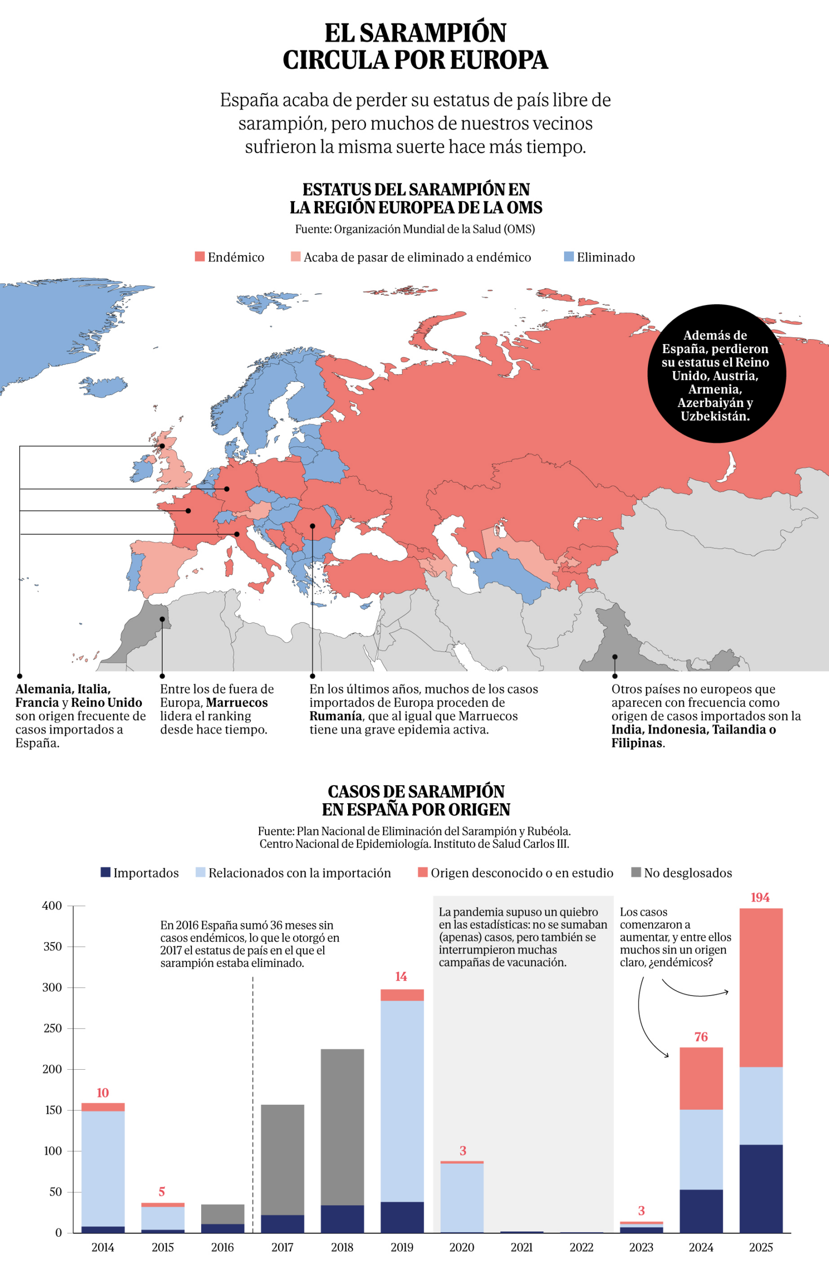 En 2025, y posteriormente a la evaluaci�n de la OMS, los n�meros empeoraron. De 227 pasamos a 397 casos, 194 de origen desconocido, casi la mitad (un 48,9%) de los casos confirmados. “Esto est� indicando que el virus est� circulando y que, por lo tanto, Espa�a ha pasado de ser un pa�s libre de sarampi�n a un pa�s end�mico”, explica Moraga-Llop.