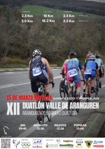 El Club Deportivo Triatlón Valle de Aranguren organiza, un año más, el ‘XII Duatlón del Valle de Aranguren’, una de las citas deportivas más importantes del municipio de Mutilva. Y lo hará el próximo domingo 15 de marzo en la Plaza Mutiloa, con el apoyo del Ayuntamiento del Valle de Aranguren y la Federación Navarra de Triatlón.