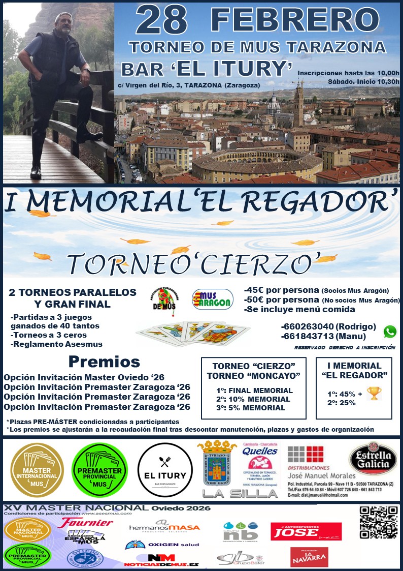 El mundo del mus tiene una cita importante este sábado, 28 de febrero, en Tarazona, donde se celebra un torneo en memoria de uno de sus miembros más queridos, Luis Lainez Pérez, conocido como ‘El Regador’. Un centenar de jugadores procedentes de cinco comunidades autónomas participan en este memorial organizado por Mus Aragón y respaldado por la Asociación Española de Mus. Fue hace un año, el 16 de febrero de 2025 cuando perdió su último órdago con la vida. Falleció muy joven, con tan solo 63 años.