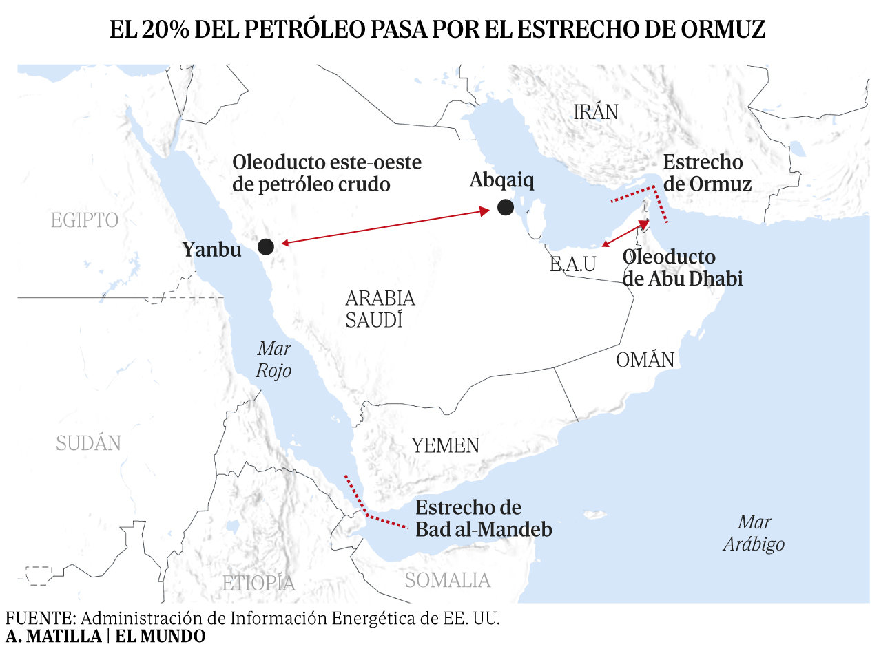 Tanto Arabia Saud� como Emiratos �rabes disponen de infraestructuras capaces de desviar el crudo a otras rutas, lo que podr�a, seg�n la EIA, “mitigar en cierta medida la disrupciones a trav�s del estrecho”. Un oleoducto de 1.201 kil�metros (construido en los a�os 80, precisamente por miedo a que la guerra entre Iraq e Ir�n cerrase el paso por Ormuz) conecta el este y el oeste de Arabia Saud�, lo que facilitar�a una salida mas directa al canal de Suez, pero su capacidad es de tan solo 5 millones de barriles al d�a, una cuarta parte de los que transitan por el estrecho.