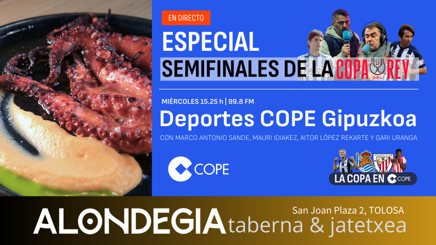 Deportes COPE Gipuzkoa vive hoy una jornada especial. El programa dirigido por Marco Antonio Sande se emite en directo desde el restaurante Alondegia, en la plaza de San Juan de Tolosa, con motivo de la vuelta de semifinales de la Copa del Rey entre Real Sociedad y Athletic Club.