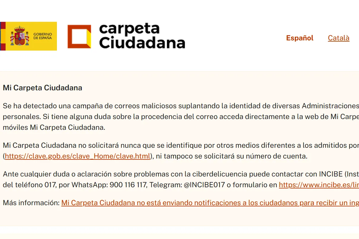 “Mi Carpeta Ciudadana ha aclarado que no solicitar� nunca a ning�n usuario que se identifique por otros medios diferentes a los admitidos por el sistema Cl@ve ni tampoco pedir� un n�mero de cuenta bancaria”, puntualiz�.