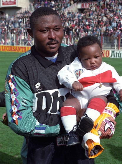 Wilfred Agbonavbare quiso quedarse cerca de esa gente los seis años que jugó en Vallecas. En el barrio, el portero nigeriano se sentía protegido de aquellas hordas de energúmenos que, rabiosos porque parecía que no había forma de meterle un gol, ni siquiera el Madrid y ni siquiera de penalti, le gritaban: “¡Ku, Klux, Klan! [sangriento grupo supremacista nacido en EEUU]” o “¡Negro, cabrón, recoge el algodón!“ sin consecuencia alguna. El documental Eterno Wilfred (Movistar Plus +) muestra una colección de sus mejores intervenciones, colgando balones al área contraria en un saque de puerta; multiplicándose como un pulpo entre los tres palos para parar tres embestidas seguidas a esa distancia en la que portero y delantero se miran a los ojos; volando con su 1,90 de estatura dentro de la portería en una palomita imposible para despejar el zambombazo de una estrella del Madrid… Las imágenes sirven de homenaje, pero también para subrayar lo dramático de lo que vino después.