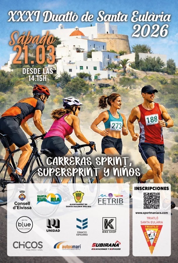 Santa Eulalia vuelve a convertirse en punto de encuentro para los amantes del deporte con la celebración del XXXI Duatlón de Santa Eulalia, una prueba ya consolidada dentro del calendario insular que reúne cada año a corredores y triatletas de distintos niveles en un formato accesible, dinámico y muy participativo.