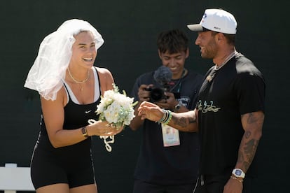 Y no termina de ser reclamo Rybakina, tan formidable con el saque y el tiro como fría en la expresión. Absoluta antítesis. No transmite, no le gustan los medios y juega y celebra con idéntico gesto siempre: el de la tristeza. Por fortuna, apareció ella. “Brilla mucho [el anillo]. Espero que mis rivales se distraigan y eso me beneficie”, bromea Sabalenka. “Hicimos algunas pruebas antes para ver si existía algún riesgo de perder el diamante al jugar, pero no hay ninguno”, añade este tenista genuina y singular, admirada por una legión de casi cinco millones en Instagram y que hace unos días no dudó en ejercitarse con un velo de novia o plantarse delante de los periodistas con su perrita en brazos.