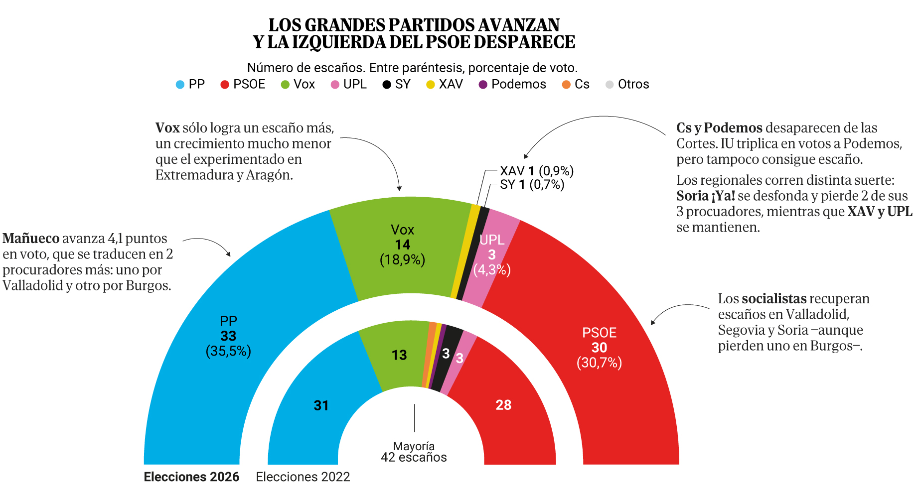 El Partido Popular logra 33 esca�os —dos m�s que en 2022—, aunque sigue dependiendo de Vox que suma un esca�o adicional a los 13 que ya obtuvo en los comicios anteriores. Mientras, el PSOE recupera fuerza con dos procuradores m�s, llegando a un total de 30.